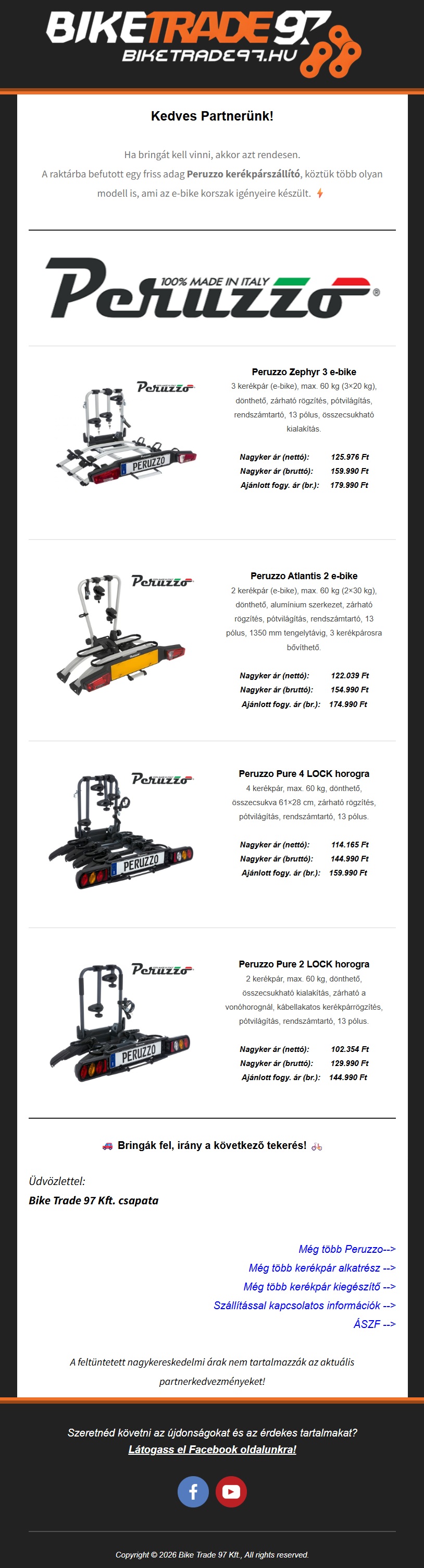 Ha bringát kell vinni, akkor azt rendesen. A raktárba befutott egy friss adag Peruzzo kerékpárszállító, köztük több olyan modell is, ami az e-bike korszak igényeire készült.